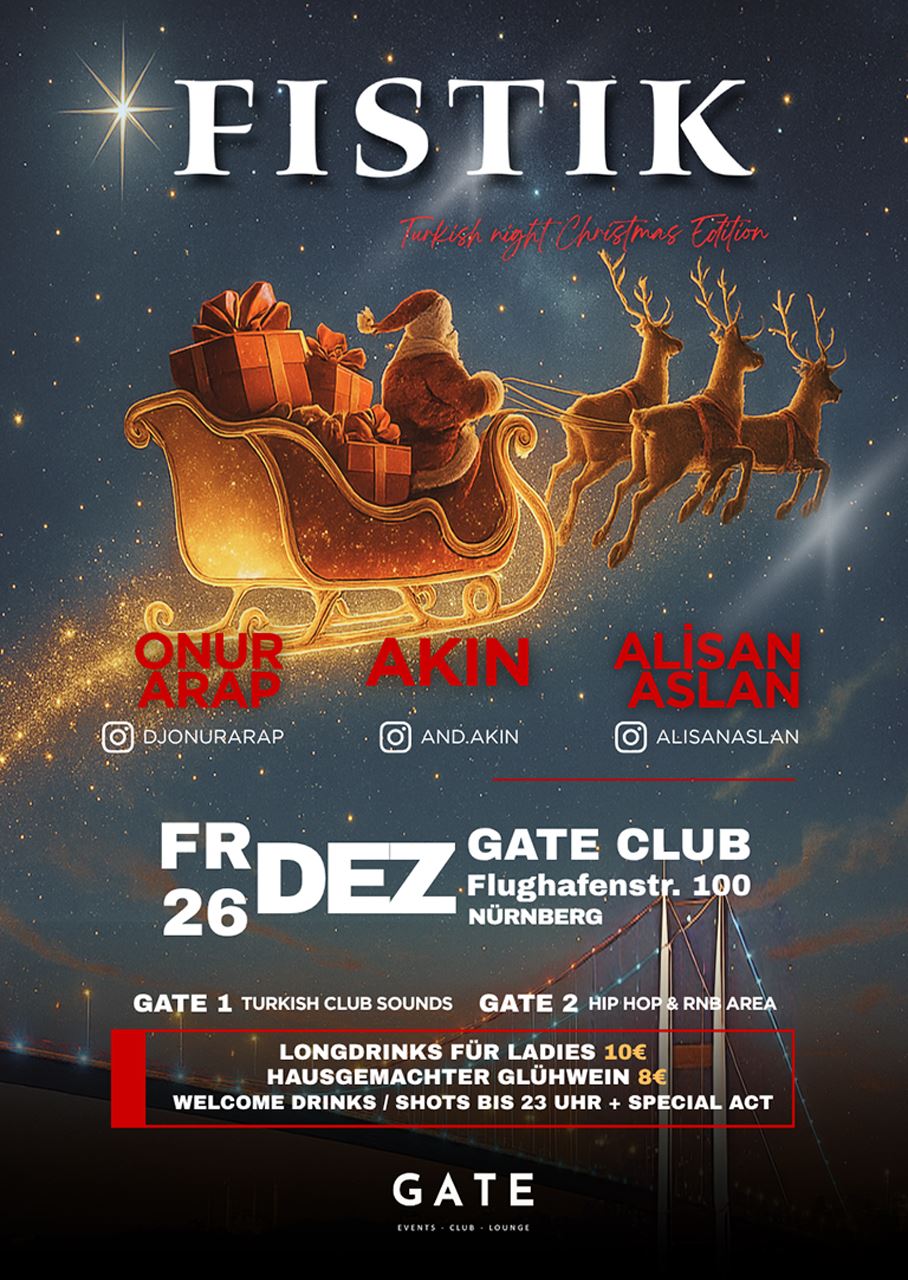 FISTIK Turkish Night Christmas Edition - Fr., 26. DezemberGATE 1 - Turkish Club SoundsGATE 2 - Hip Hop & RnBDoors Open: 22 Uhr